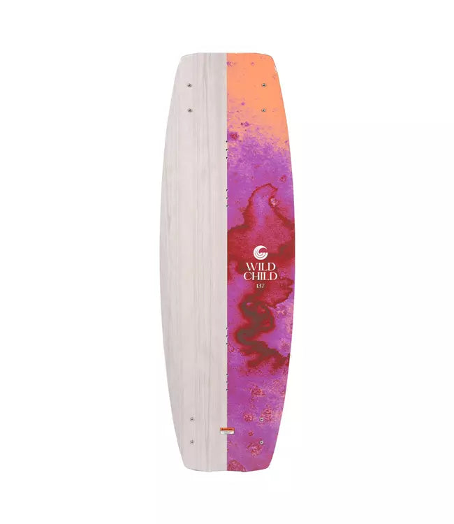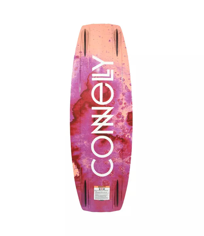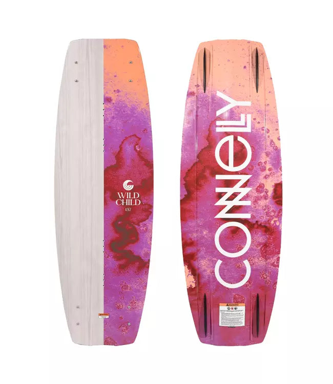 The Connelly Wild Child Wakeboard is crafted for intermediate to advanced female riders seeking high performance and versatility. It includes a raised rail between the bindings to simplify landings and reduce edge catches, a robust System 80 Core that balances flexibility with durability, and four 1-inch bolt-on fins to enhance grip and maneuverability on the water.