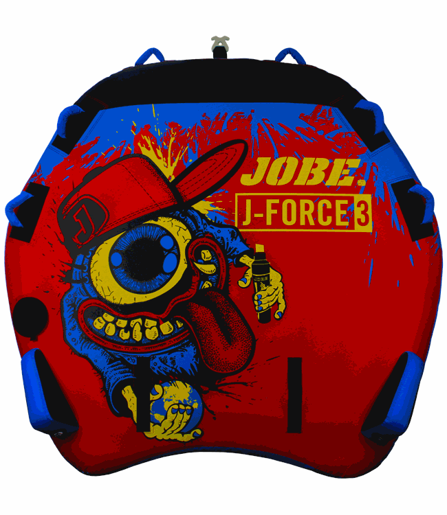 J FORCE 3 is a wild ride for up to 3 thrill-seekers! Defy centrifugal force with this towable's topside stabilizer fins. The 6 deluxe soft grip handles with neoprene knuckle guards provide a sure and comfortable grip. J FORCE 3 has a tough 30-gauge PVC bladder, fully covered with an 840-denier double-stitched nylon cover. It is equipped with a quick connect for easy and secure tow rope hook-ups.
