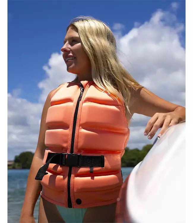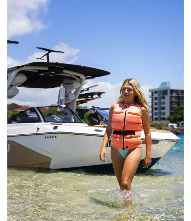 Featuring a classic design with sleek screens, efficient stitch paneling, and a pop of color on the side for added detail. The Follow Corp Womens Life Vest sets a new standard in the market, offering exceptional quality at an affordable price. This is a must-have for anyone looking to stay ahead of the competition wether they are wakeboarding, water skiing, kneeboarding or even tubing.
