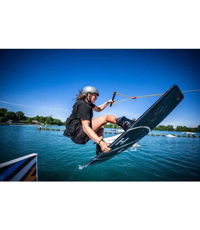 The Hyperlite Impulse Cable Wakeboard is designed for beginners and intermediate riders seeking great performance at a great price. Its smooth continuous rocker allows for easy carving, while the mid-body beveled edge and concave center help soften landings and improve control on features. The concave tip and tail add stability when carving and locking onto obstacles. This board is an excellent choice to enhance any cable riding session.