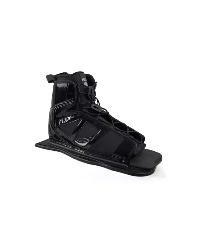 Flex is the ultimate ski binder, engineered for quicker turns. Constructed from a lightweight composite platform, it has no dead spot, allowing the ski to flex naturally and achieve smooth curves. Featuring a dual lace design that secures the foot, a floating tongue that stops pressure points, and a deep heel pocket for ankle stability, the Flex binding adjusts easily and lets you ski with either aggressive or relaxed control. Its elastic zones provide enhanced freedom.