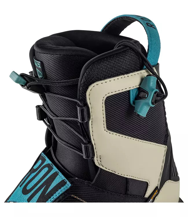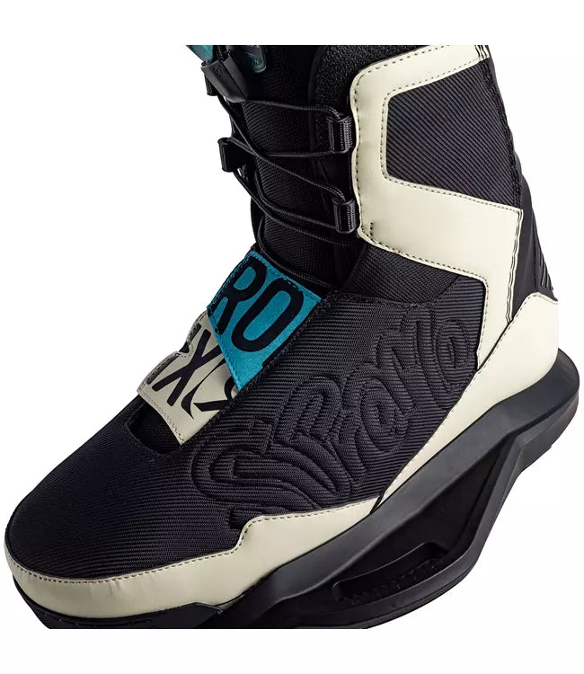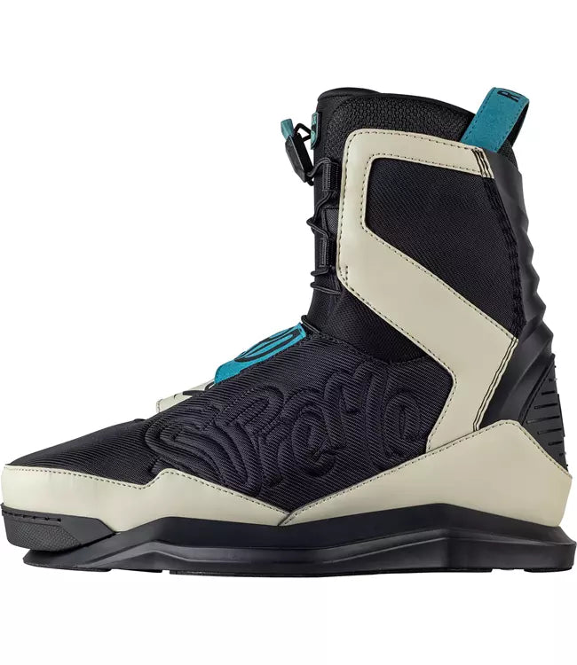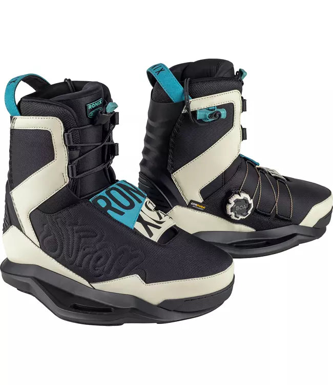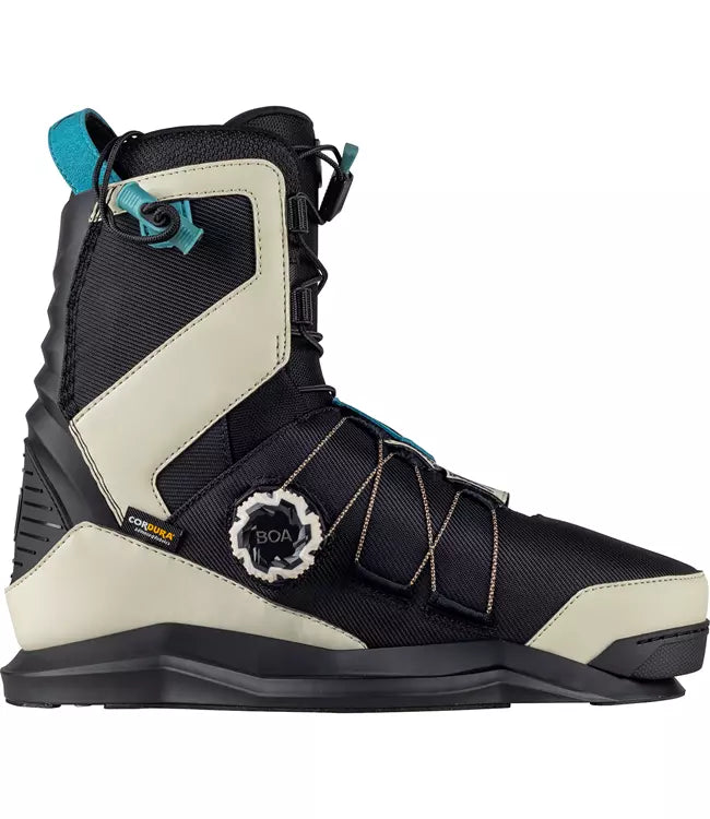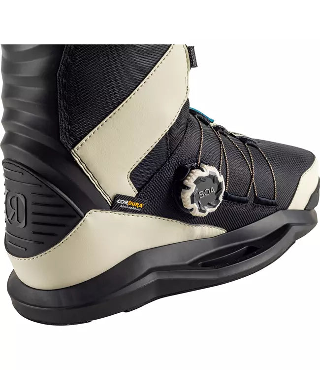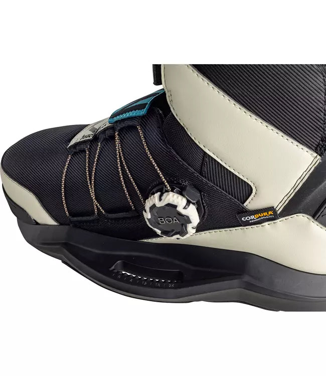 An exceptional wakeboard boot featuring the innovative BOA® flap system for effortless entry and precise adjustment. The Supreme combines unparalleled board feel with frictionless functionality, allowing riders to quickly slip in and out. Its double-lasting construction pairs an Intuition+ heat moldable liner with the supportive Mainframe 2.0 High Cut skeleton for targeted reinforcement. Crafted from durable Cordura Ballistic Twill Nylon with distinctive off-white materials and blue suede accents, this boot delivers head-turning style while standing up to demanding conditions.