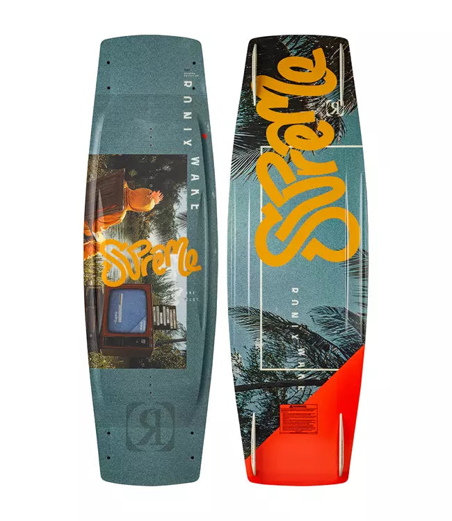 The Supreme Wakeboard from Ronix redefines adaptability with its enhanced hybrid design. This premium board now features refined contours where the flat sections transition more gradually into the continuous rocker center. By blending various rail, rocker, fin, and construction elements, Ronix has created a more predictable riding experience. The subtle yet significant improvements to the board's outline deliver smoother transitions and greater ease of use, making this versatile performer even more accessible to riders of all styles.